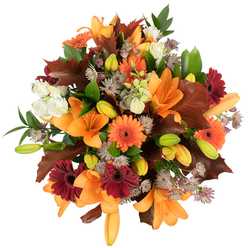 True to the artistry of Garston's skilled florists, this radiant arrangement marries warmth of colour and a gentle sense of abundance. A hand-tied bouquet of roses-each bloom opening from a golden-cream heart to sunset shades of coral, peach, and deep salmon-unfurls like a visual symphony, evoking the hue of doorways and blossoms spotted around Garston's village lanes. The mastery lies in the interplay of colours: petals edged in rosy pink or apricot, mingling with lush, dark green foliage that frames the flowers without crowding them. Some roses are tightly furled, their promise yet to open, while others reveal intricate layers-a tactile softness almost perceptible through the screen. At the bouquet's foot, thoughtfully paired, sits a Thorntons Orange Crisp chocolate pouch in light beige, its bold script and tempting chocolate illustrations catching the eye like treats offered in a favourite Garston café. Two individual truffles, glossy as river stones, rest beside the packet, inviting a moment of sweet indulgence. This creation-perfect for those milestone moments, be it an anniversary on the High Street, a birthday, or an evening of quiet celebration at home-offers both visual splendour and sensory delight. With every detail, from the cool, verdant foliage to the creamy chocolates, it conjures the comforting yet joyful atmosphere that Garston locals treasure.